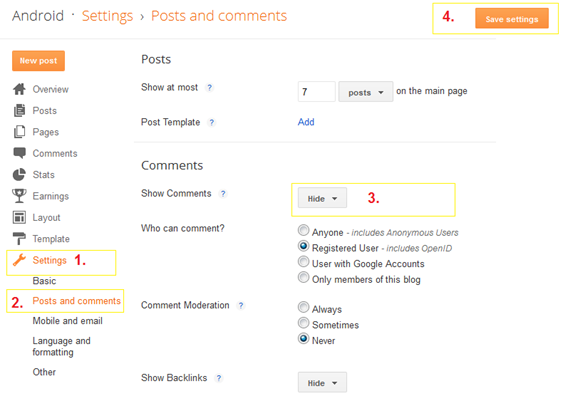 1. Hide Existing Comments - The best way to start off is by hiding the comments made from the Blogger System. To do that, go to Settings > Posts and Comments and set the Show Comments option to Hide and Save the Settings